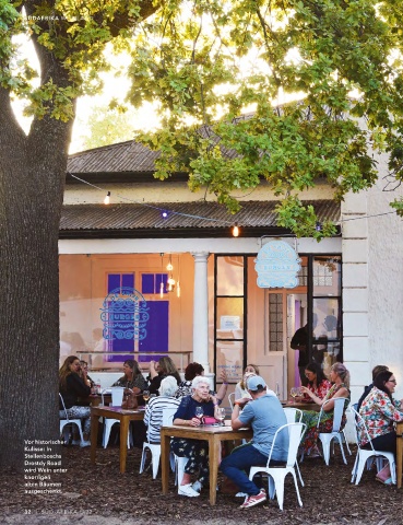 SÜDAFRIKA WEINLAND Vor historischer Kulisse: In Stellenboschs Drostdy Road wird Wein unter knorrigen alten Bäumen ausgeschenkt. 32 | SÜD-AFRIKA 3/22